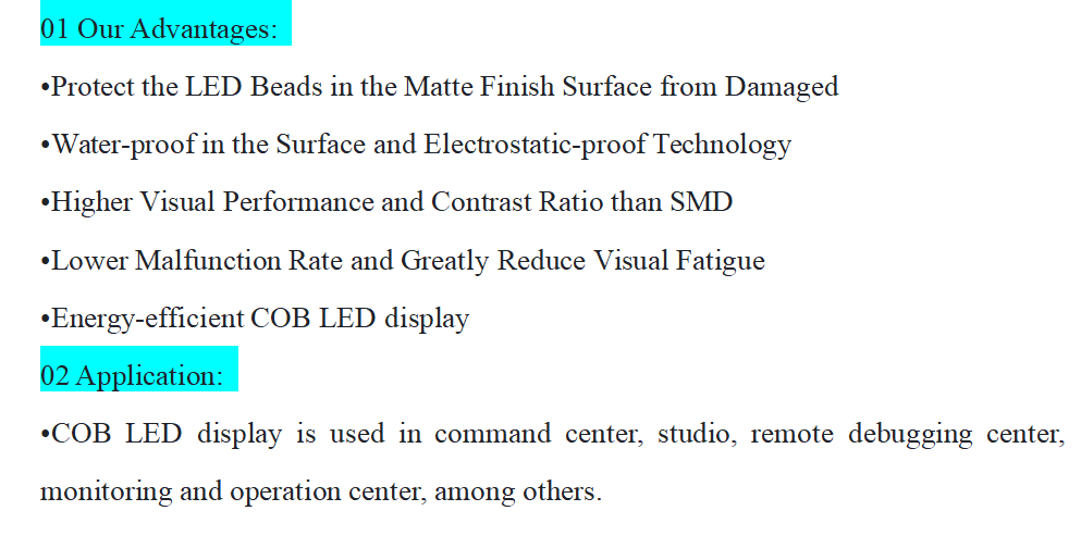 Application:COB LED display is used in command center, studio, remote debugging center, monitoring and operation center, among others.