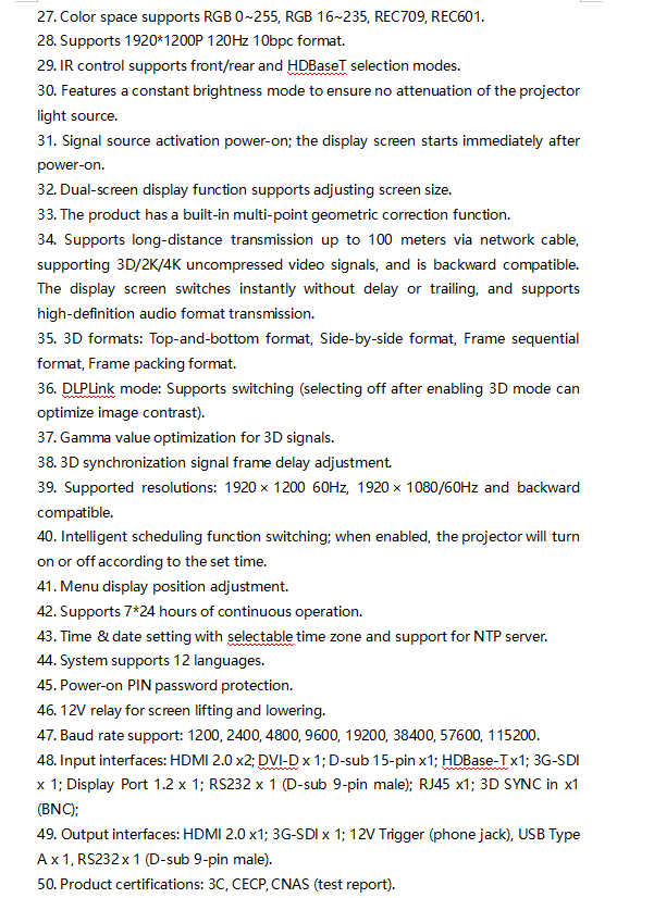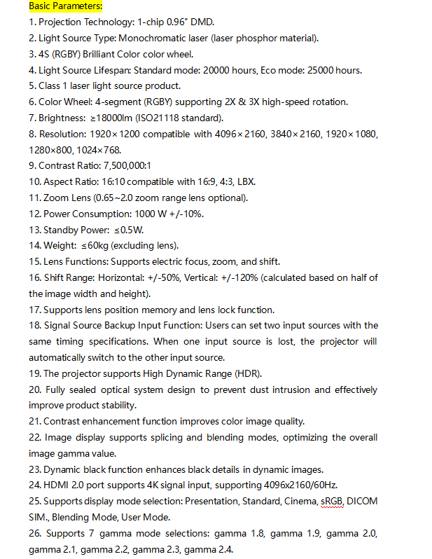 4. Light source lifespan: Standard mode: 20,000 hours, Eco mode: 25,000 hours.
